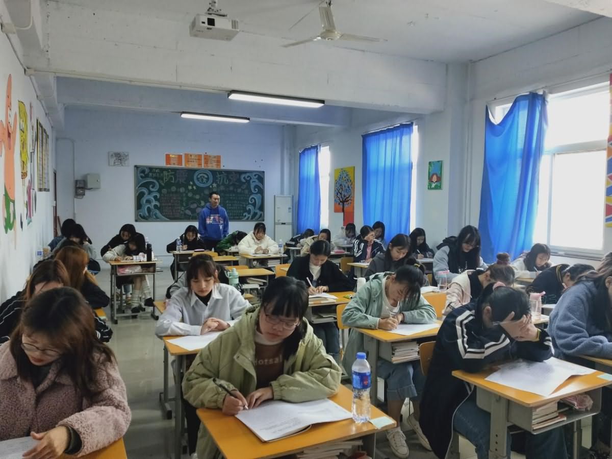 考试期间,学生认真作答。监考教师严格按照监考安排执行表监考,核对监考场次、时间、地点、参考学生人数,确保每一科考试顺利进行。