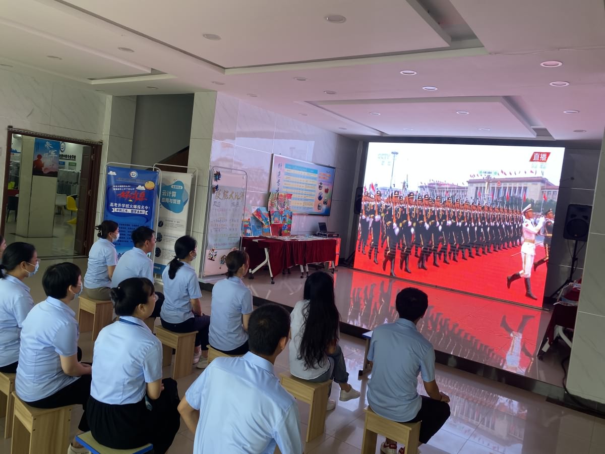 2021年7月1日上午8时,庆祝中国共产党成立100周年大会在北京举行,中共中央总书记、国家主席、中央军委主席习近平发表重要讲话,石家庄市现代经贸中等专业学校组织全体教职工集中观看,感悟百年党史,聆听书记教诲,奋进新的征程。